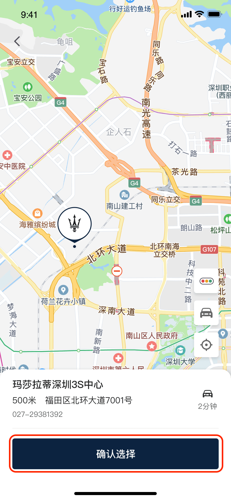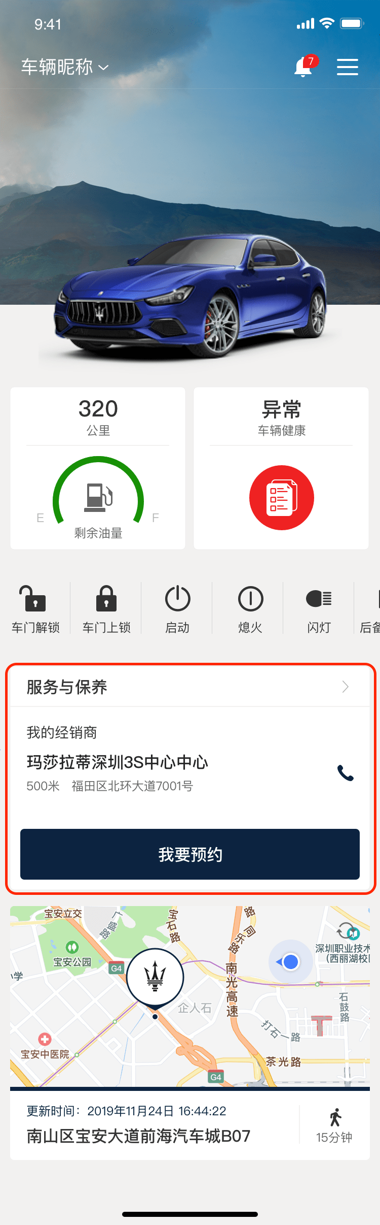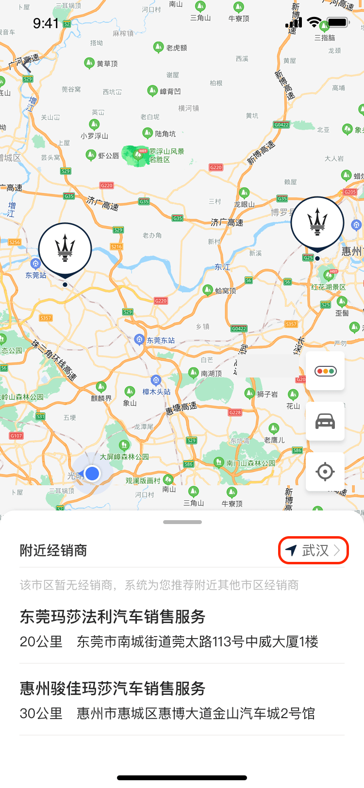 通过点击“服务与保养”进入并按照提示选择您的首选经销商,打开APP的定位权限,可以展示您附近和当前城市的经销商供您选择: