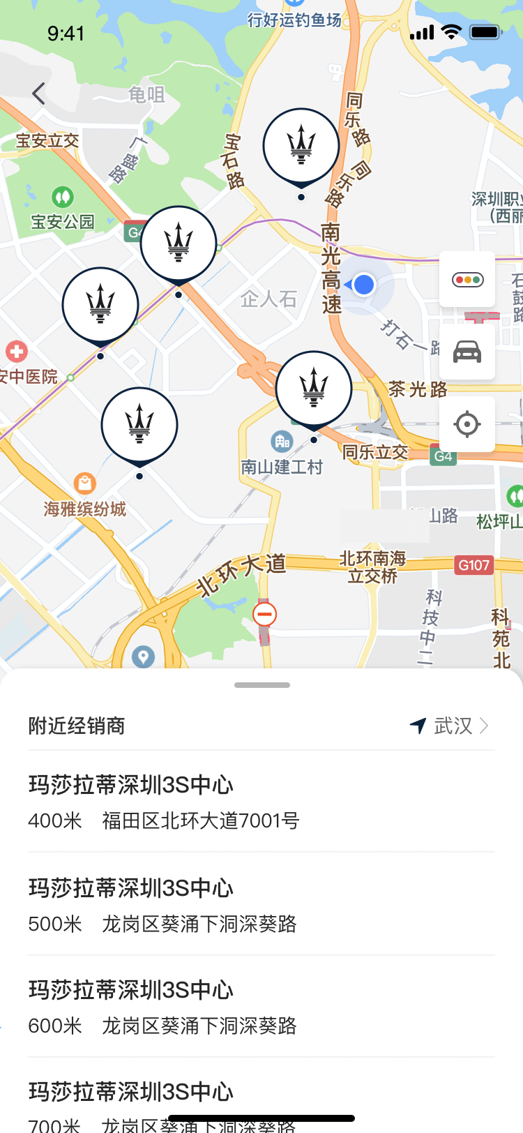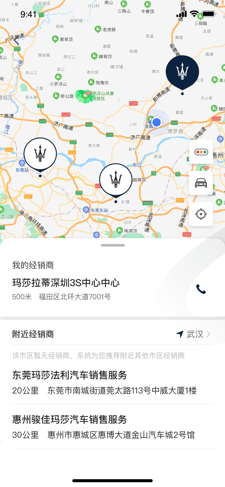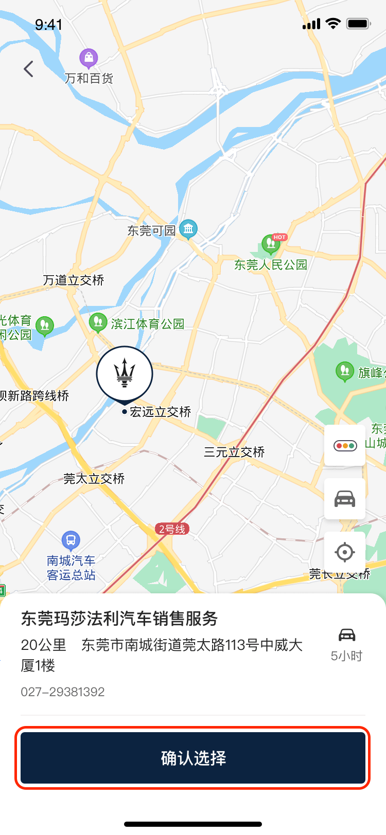 通过点击“服务与保养”进入并按照提示选择您的首选经销商,打开APP的定位权限,可以展示您附近和当前城市的经销商供您选择: