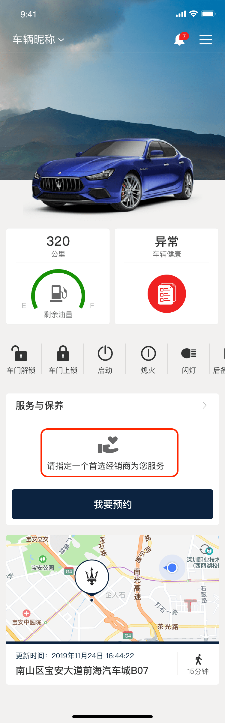 如果您看到首页“服务与保养”入口显示“请指定一个首选经销商为您服务”, 为了更快预约服务与保养,建议您指定一个经销商作为服务首选。