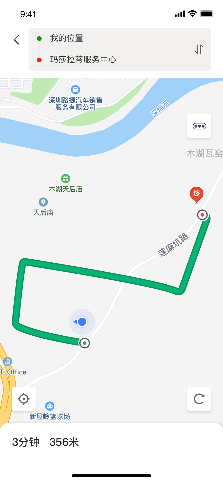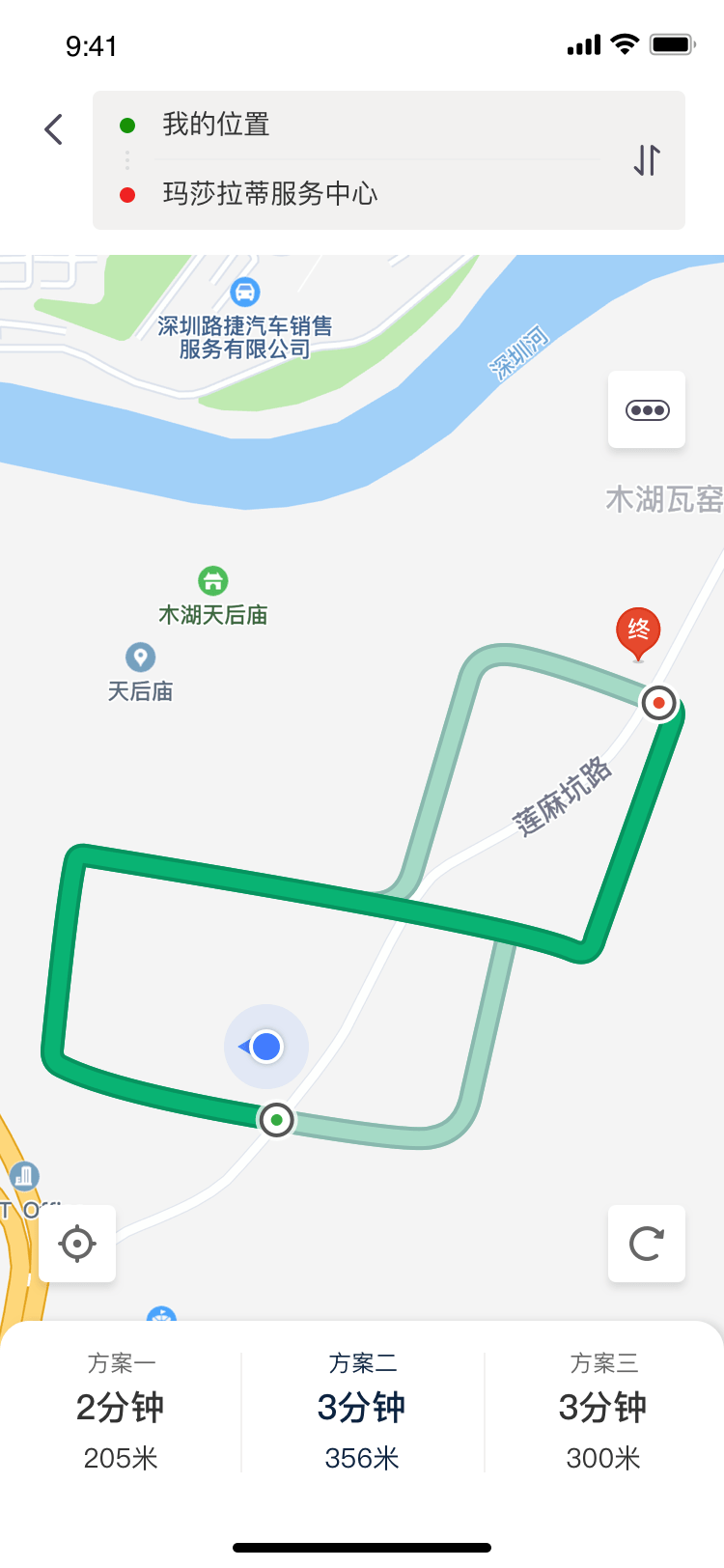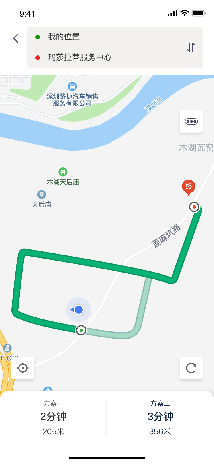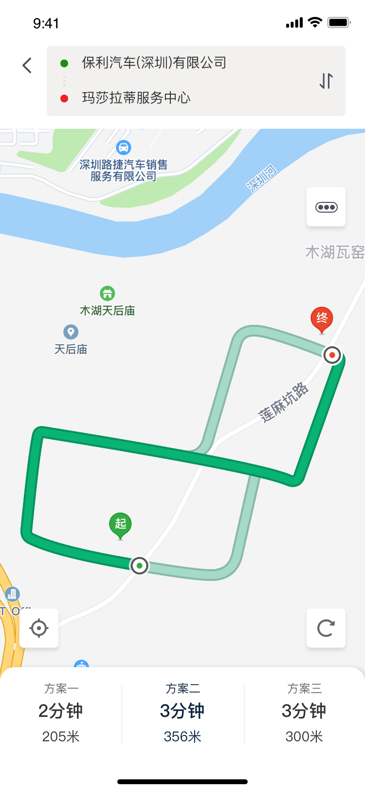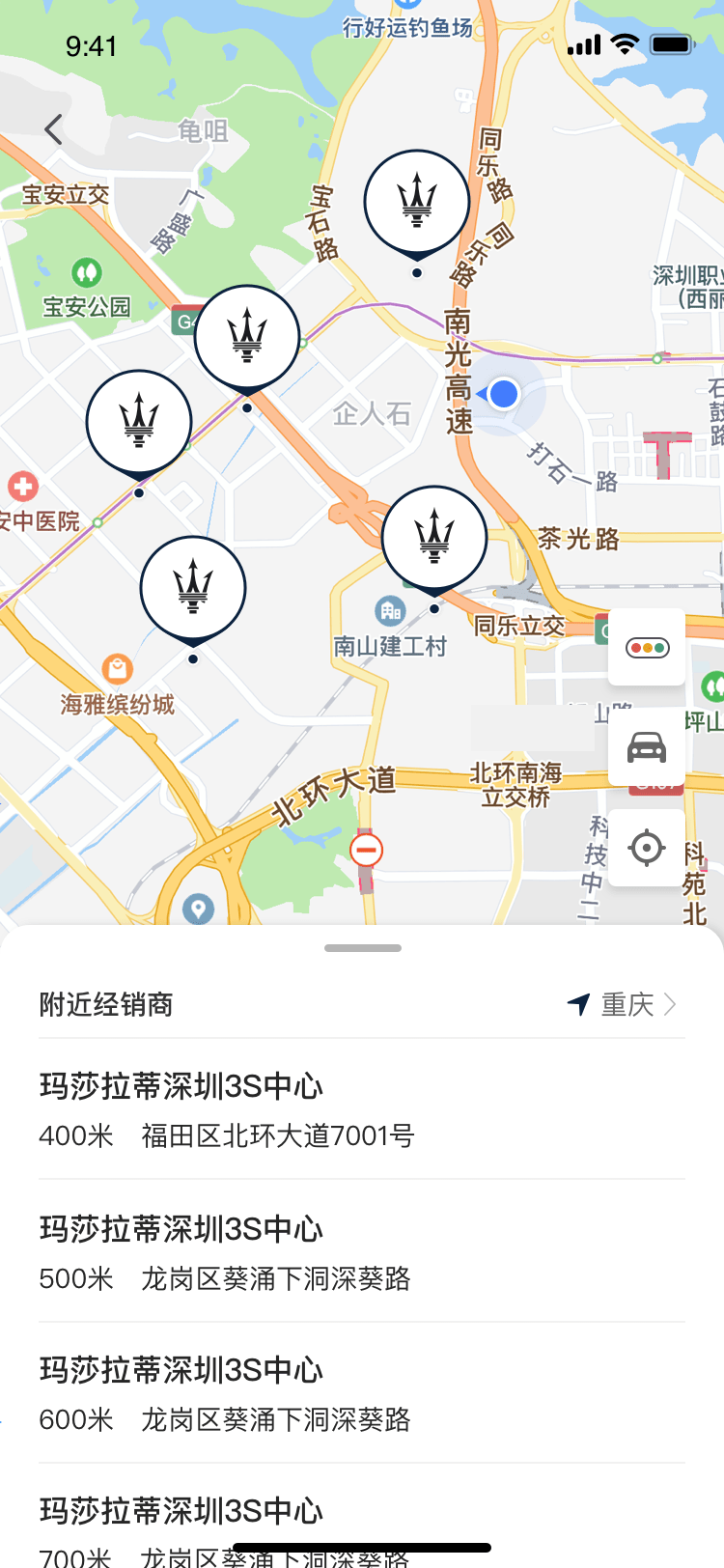 点击地图上的经销商后,可以展示到达此经销商的推荐路径,给您选择提供参考。