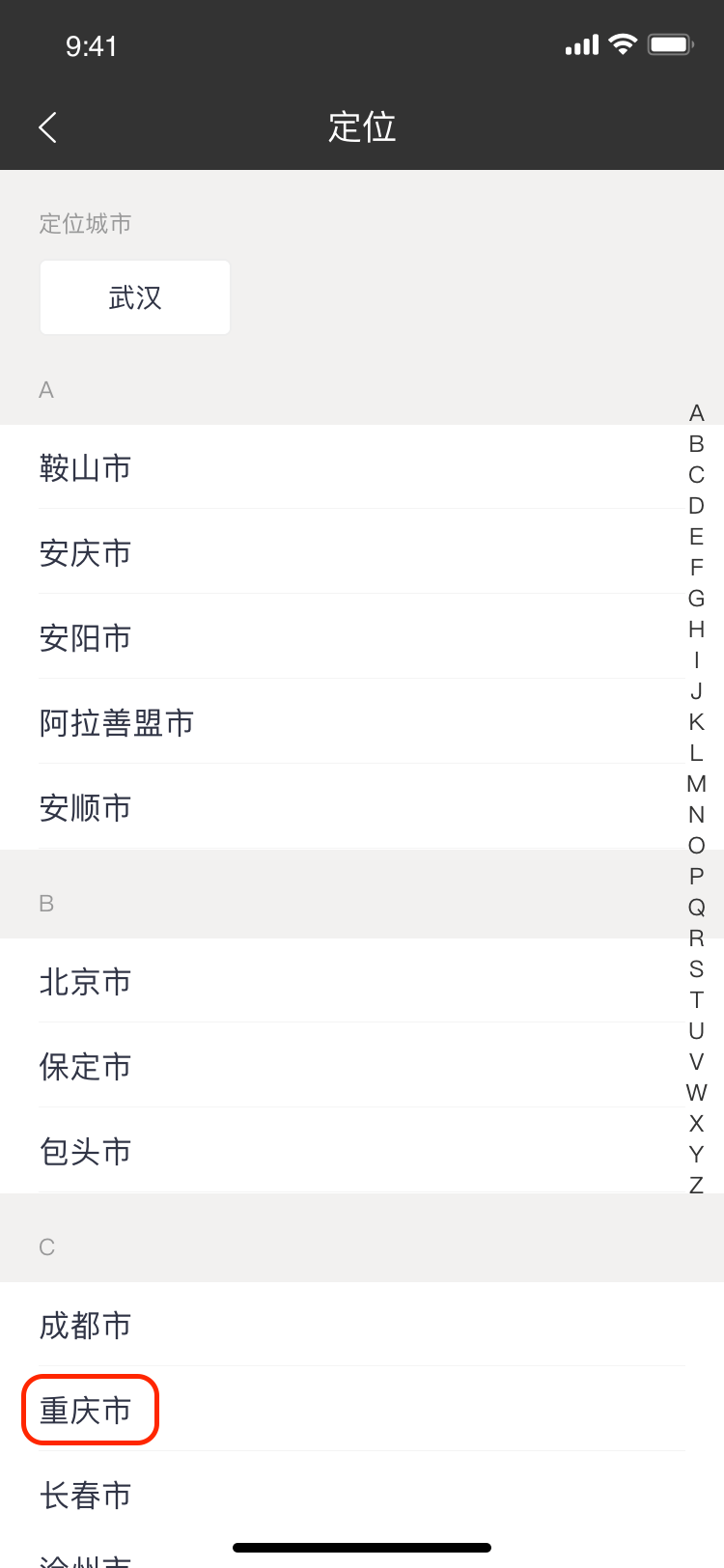 点击定位城市,进入城市定位列表,该列表展示的是存在经销商的城市