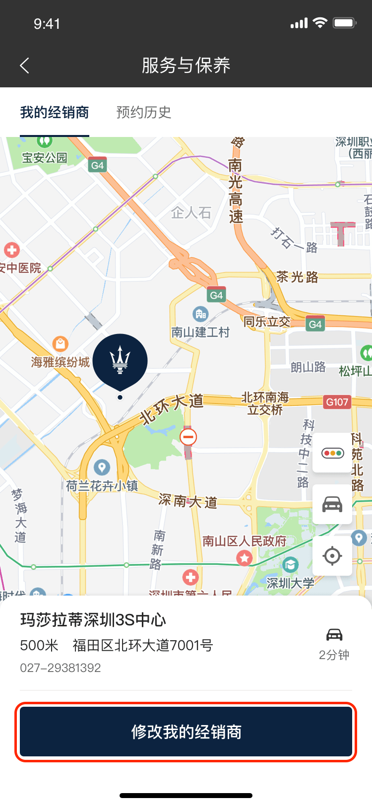 您可以通过首页“保养与服务”入口进入模块后,在“我的经销商”选项卡,查看和修改您的首选经销商。