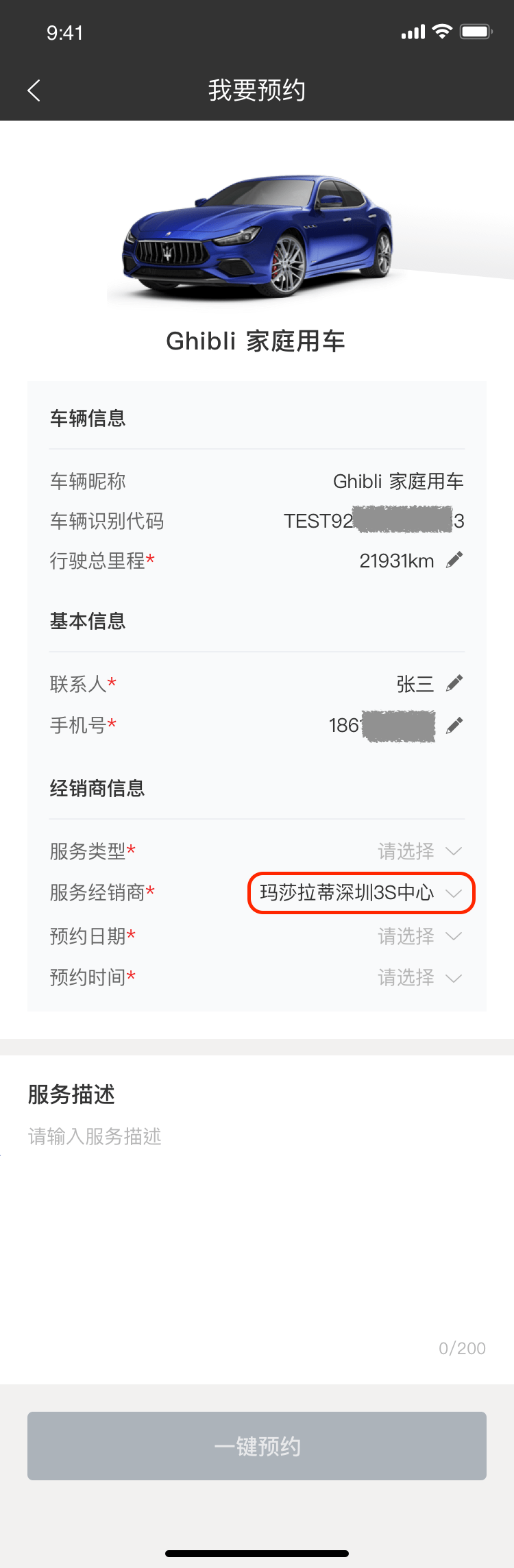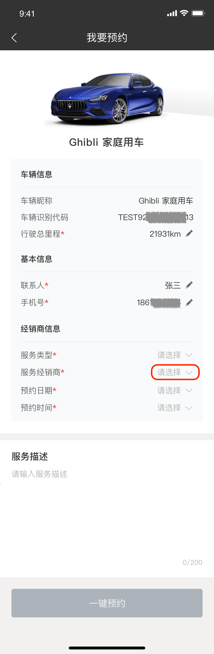 您可以点击首页“服务与保养”入口中“我要预约”进入预约页面,填写相关信息点击“一键预约”进行预约操作。