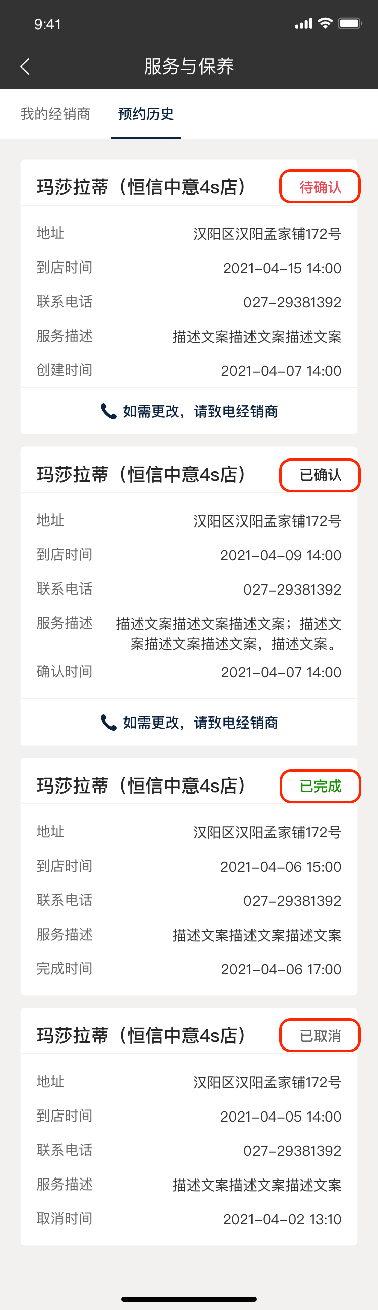其中状态为“待确认”和 “已确认”预约单,您可以通过电话联系预约的经销商。沟通后将由经销商为您修改或者取消预约。