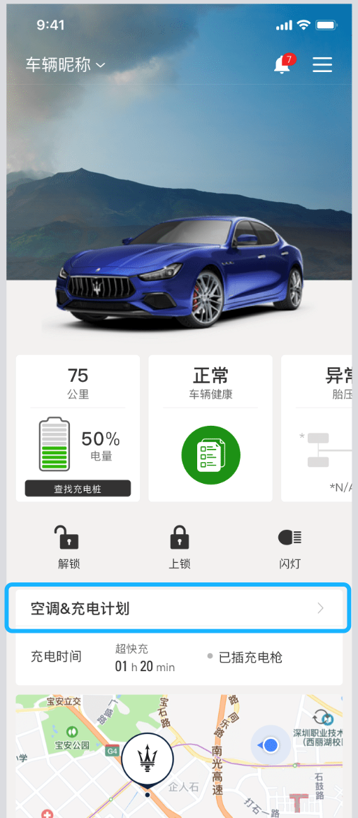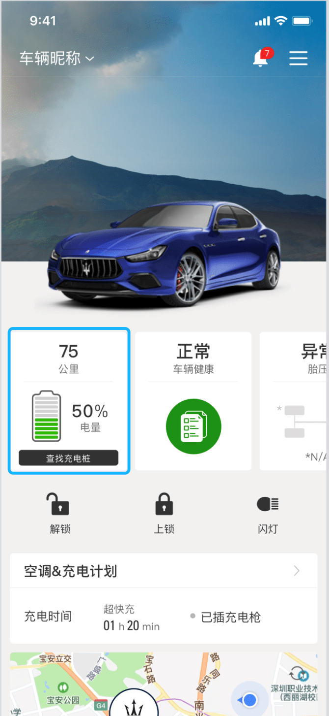 登录【玛莎拉蒂互联APP】进入主页面-点击【电量】小卡片进入车况信息页面: