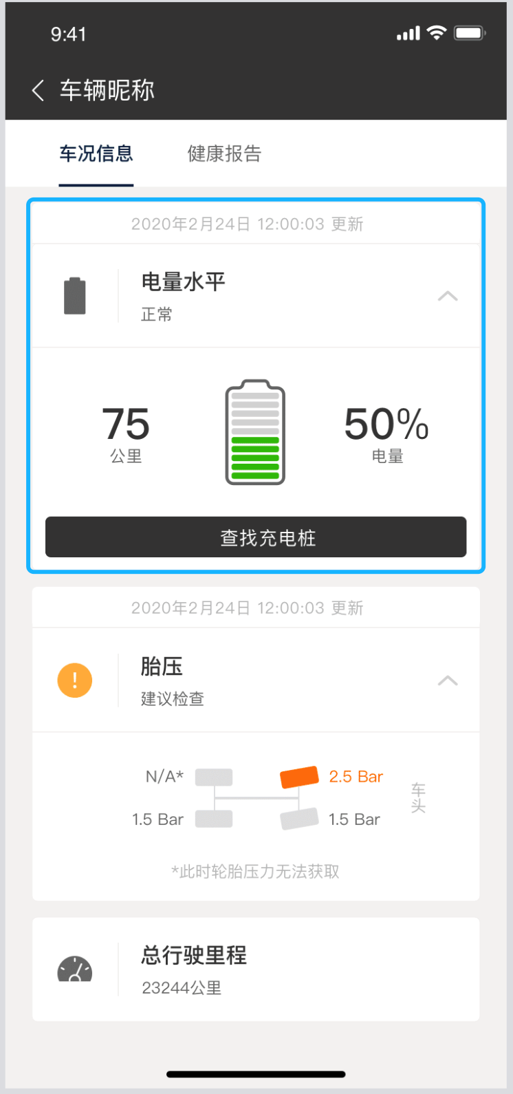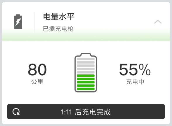 1.若车辆当前未处于充电状态:页面展示当前剩余电量百分比,及电量可续航里程数。
