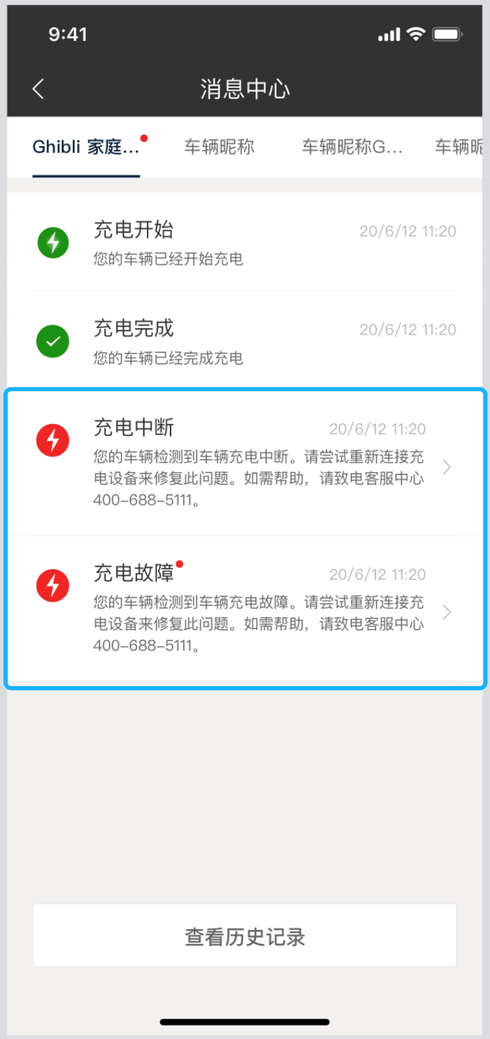 若充电过程发生故障/中断,您会在玛莎拉蒂APP消息中心收到如下信息。建议您及时检查充电枪连接状态,或联系玛莎拉蒂客服中心(400-688-5111)寻求帮助。