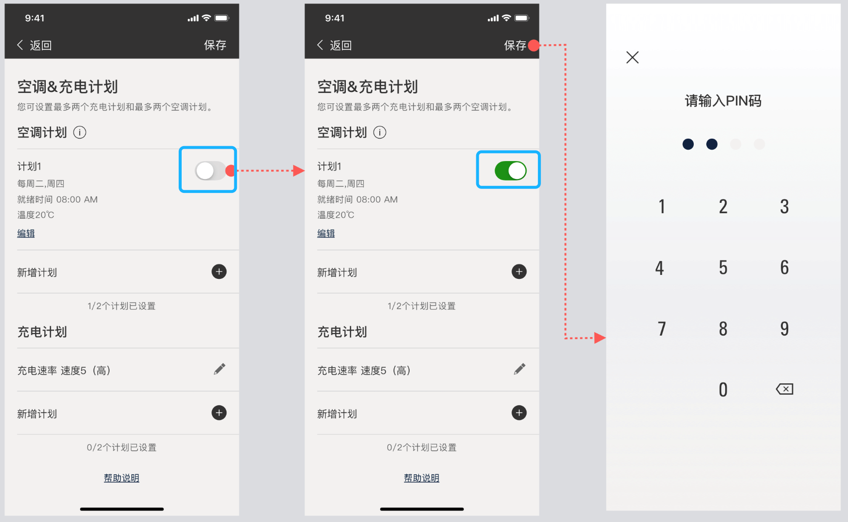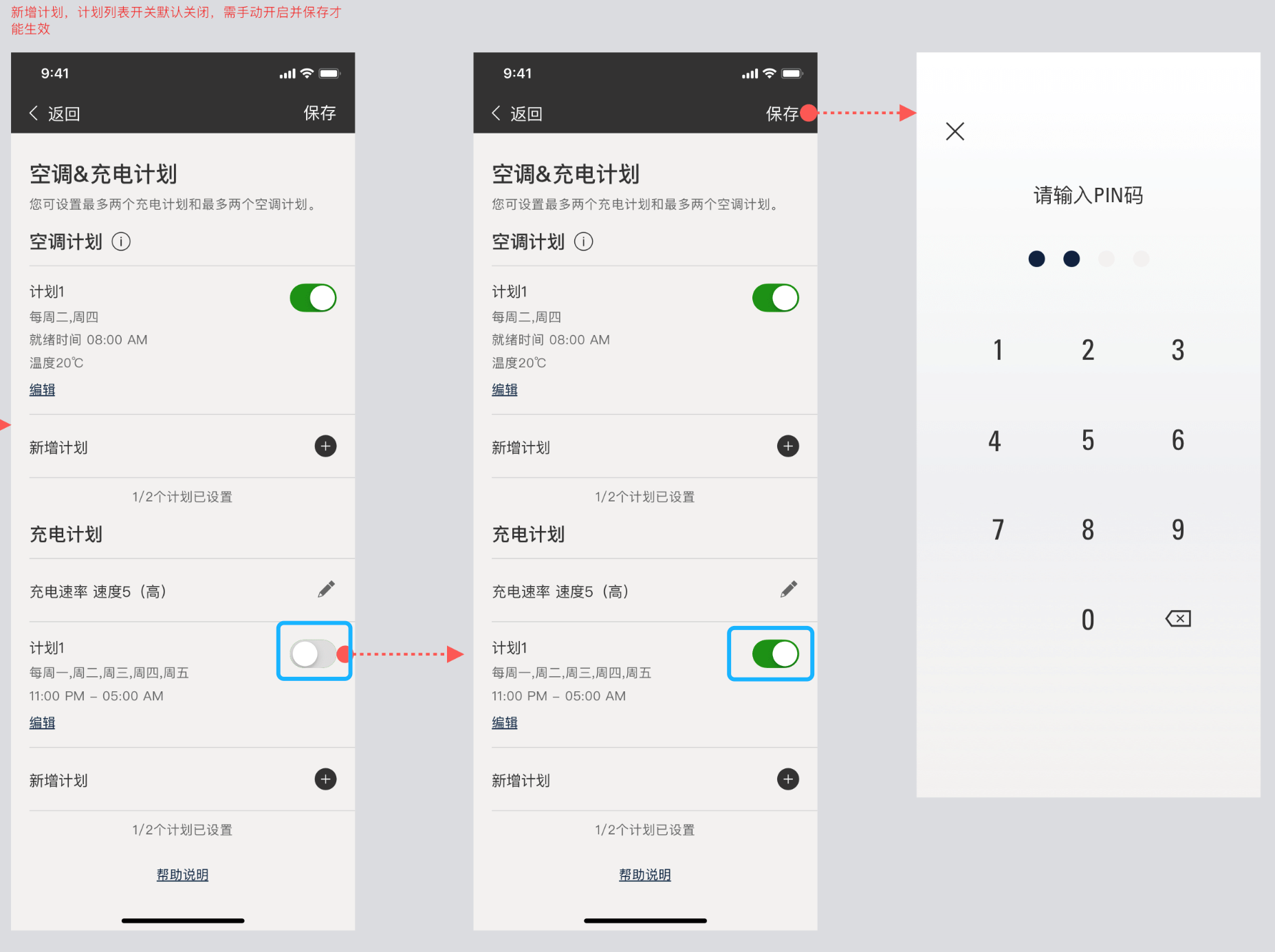 您如果是首次配置的充电计划,充电计划默认是关闭状态,或者之前该充电计划是关闭状态,需要您手动打开开关,并输入PIN码,如下图: