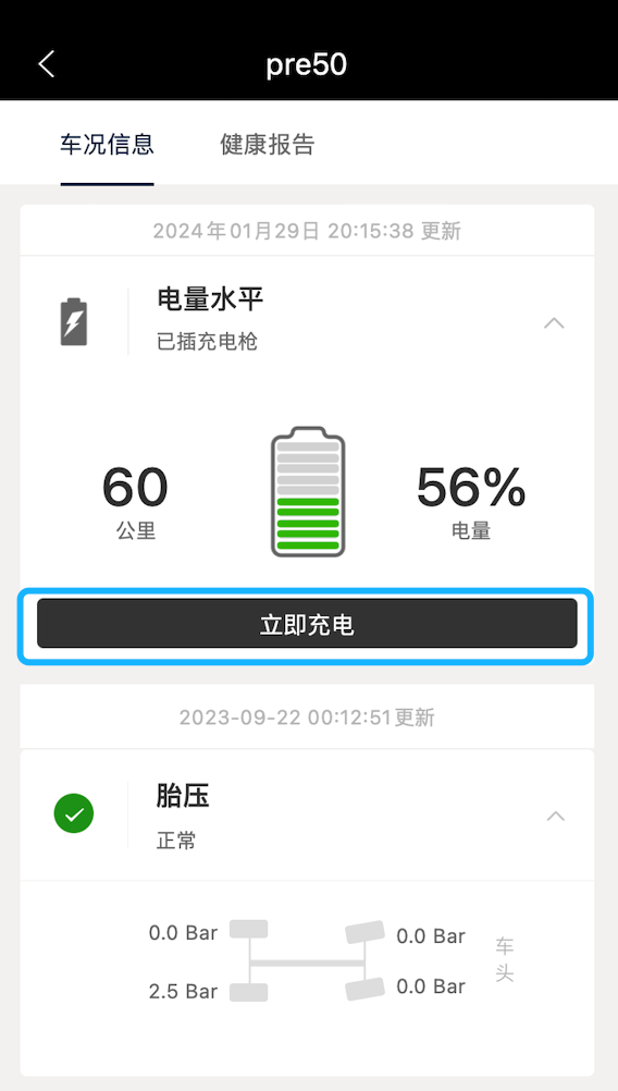 2.若车辆当前处于充电状态:车况页面电量水平卡片展示当前剩余电量百分比、预计充满电所需时间及电量可续航里程数。