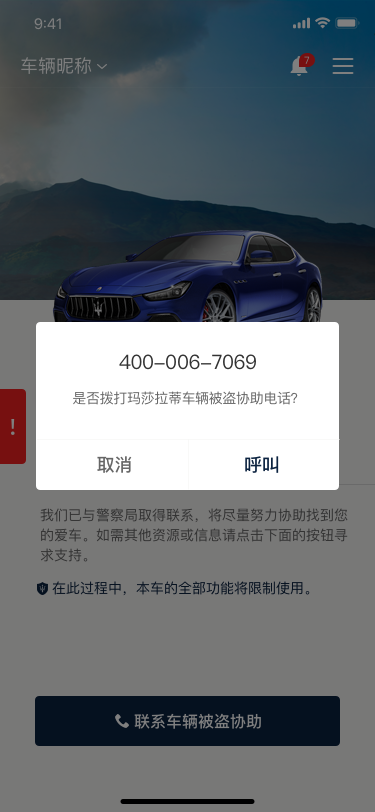 3)点击页面上【联系车辆被盗协助】,可再次联系Maserati Stolen Vehicle Assistance。点击后页面弹窗确认是否呼叫。