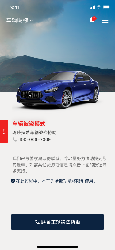 4)用户也可以通过【客服中心】联系Maserati Stolen Vehicle Assistance。