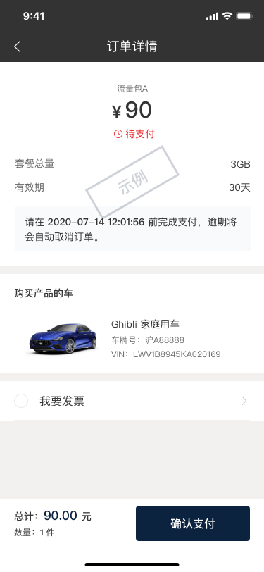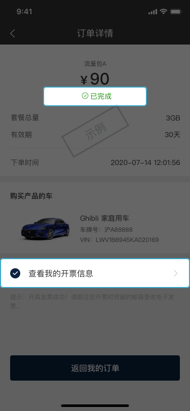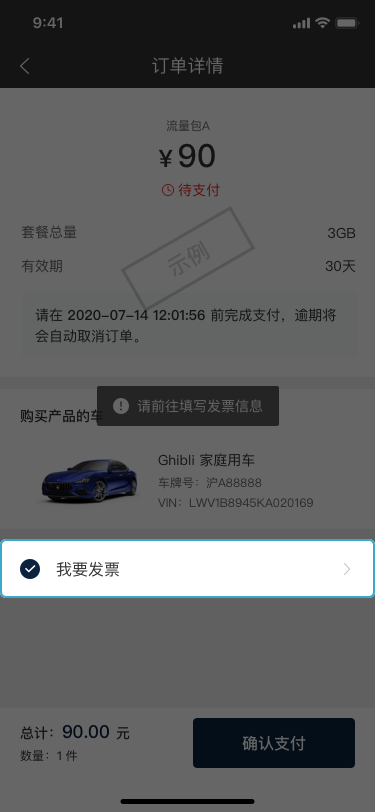 购买流程:选择目标车辆-->选择目标流量包-->查看流量包详情-->选择是否开具发票(填写发票信息)-->确认订单信息-->确定支付-->支付成功/失败。