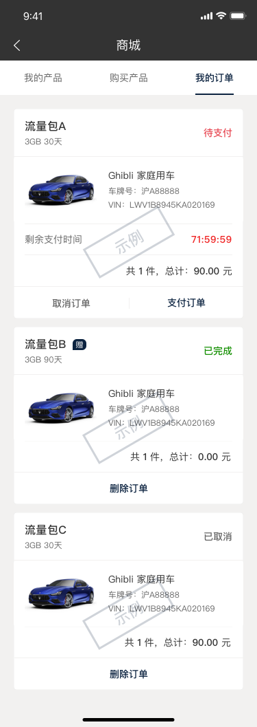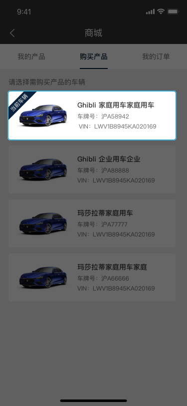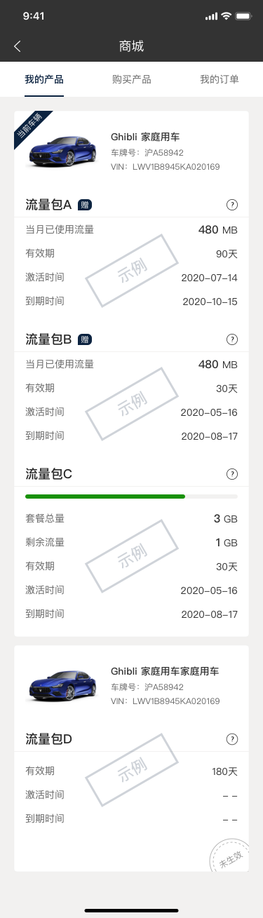 车主进入商城,点击【我的产品】可查看该用所有已认证车辆所有已购买的流量包。