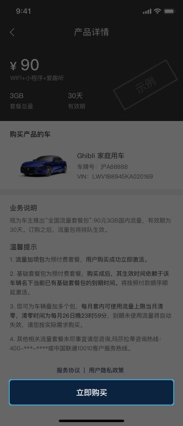 介绍:用户购买全新的Maserati系列智能车联车辆后,如果用户想续费或增加流量包,可进入电子商城按需购买流量包产品。