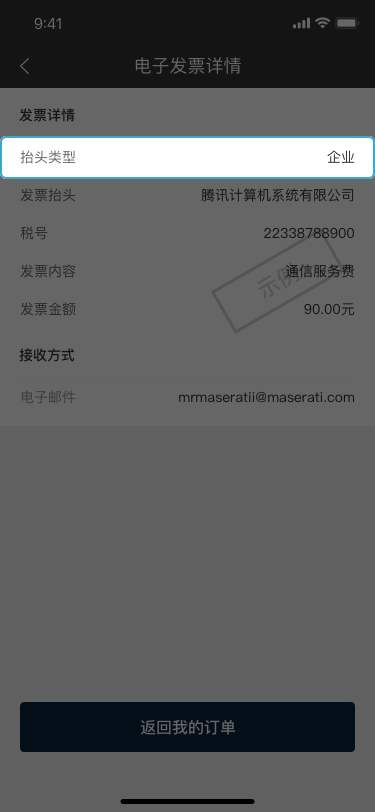 用户可通过订单详情页--> 查看我的开票信息,跳转至电子发票详情页查看开票信息。